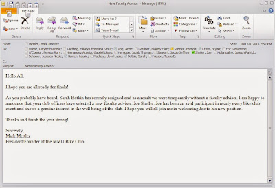 The thing about a bike is that you can ride it or walk it. If you want to cross some rail tracks to get under the interstate to go to a nearby college campus, sometimes you briefly walk it. “Watch out if one of those rails starts to vibrate,” quipped the president of the MMU bike club, showing the kind of leadership only a student can. I’ll try to protect you by not mentioning your name, OK Mark?