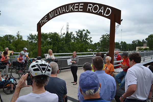 July 12--Official opening ceremony for new bridge over Indian Creek. It's a fairly high bridge, designed to recall the rail history of this route. Images without captions, mostly I think you can tell it's the ceremony, crowd or speakers: